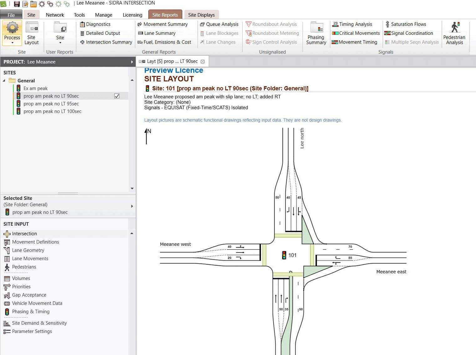 Detailed Output & Performance Measures: Calculates key performance indicators (KPIs) such as degree of saturation, control delay (seconds/vehicle), queue lengths (95th percentile), stops, fuel consumption, and CO2 emissions.