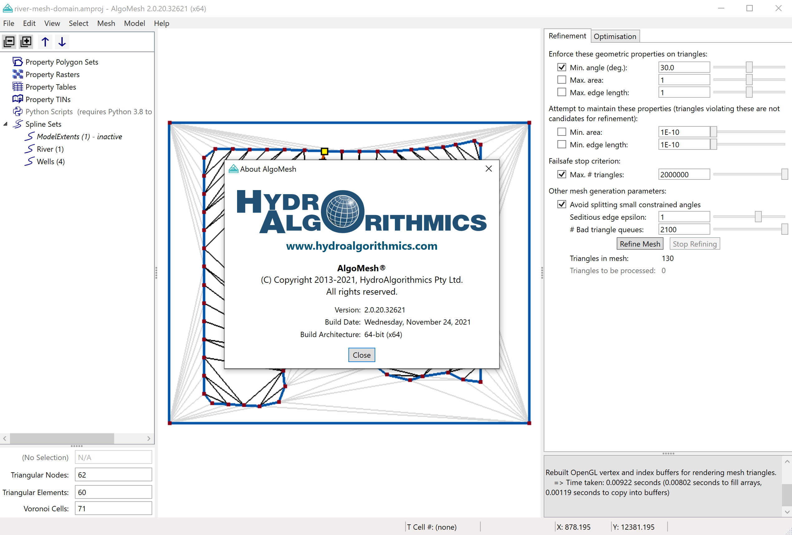AlgoMesh is a software tool providing implementations of two complementary algorithms for generation of unstructured triangular and Voronoi grids. It incorporates a comprehensive, easy-to-use graphical user interface (GUI) to assist in the model-building process. AlgoMesh’s primary focus as a model-building tool is producing input files for MODFLOW-USG, MODFLOW 6 and HydroGeoSphere™ simulations. However, its two-dimensional grid generation capabilities are quite general and it may be used as a powerful standalone mesh generator for any purpose. The following sections of this guide present a summary of the grid generation capabilities of AlgoMesh and its user interface functionality.