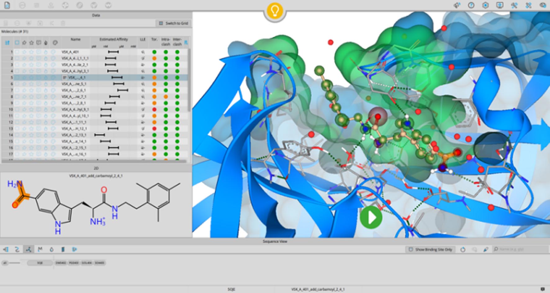 BioSolvetIT SeeSAR is a highly interactive, intuitive visualization and analysis software for structure-based drug design (SBDD). Its core philosophy is to provide medicinal chemists with immediate, real-time feedback on how structural changes to a potential drug molecule (ligand) will affect its binding affinity and interactions with a target protein. Users can visually “grow,” “evolve,” and modify molecules directly in the 3D binding site, with SeeSAR instantly calculating and displaying updated binding affinity estimates (HYDE scoring), synthetic accessibility, and potential toxicity flags. This dramatically accelerates the lead optimization cycle.