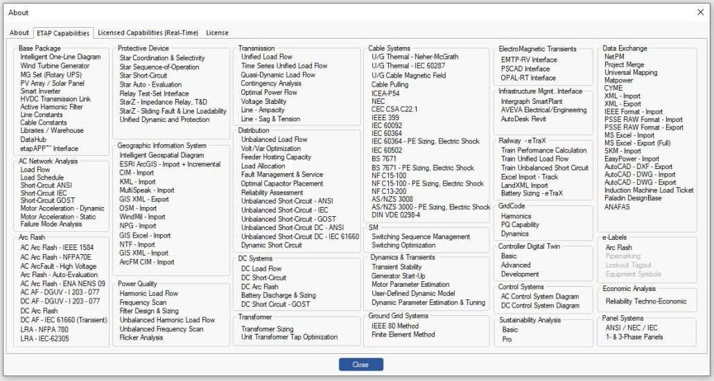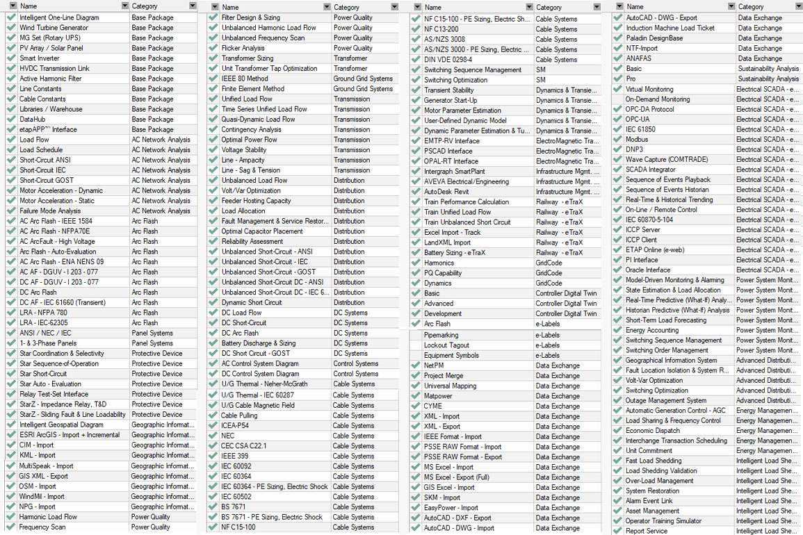 ETAP offers a suite of comprehensive electronic engineering software solutions that include load current, short circuit, transient impedance, amplifier synchronization, cable power, optimum power flow, and more. Its modular throughput can be customized to meet the needs of any company from small to large power systems.