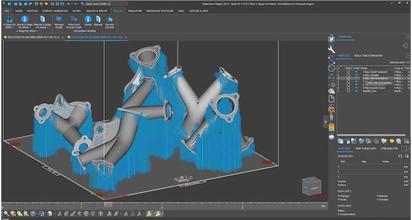 Seamless Magics Integration: Works directly within the Magics environment for part repair, nesting, and preparation. The support structures are fully editable using Magics tools.