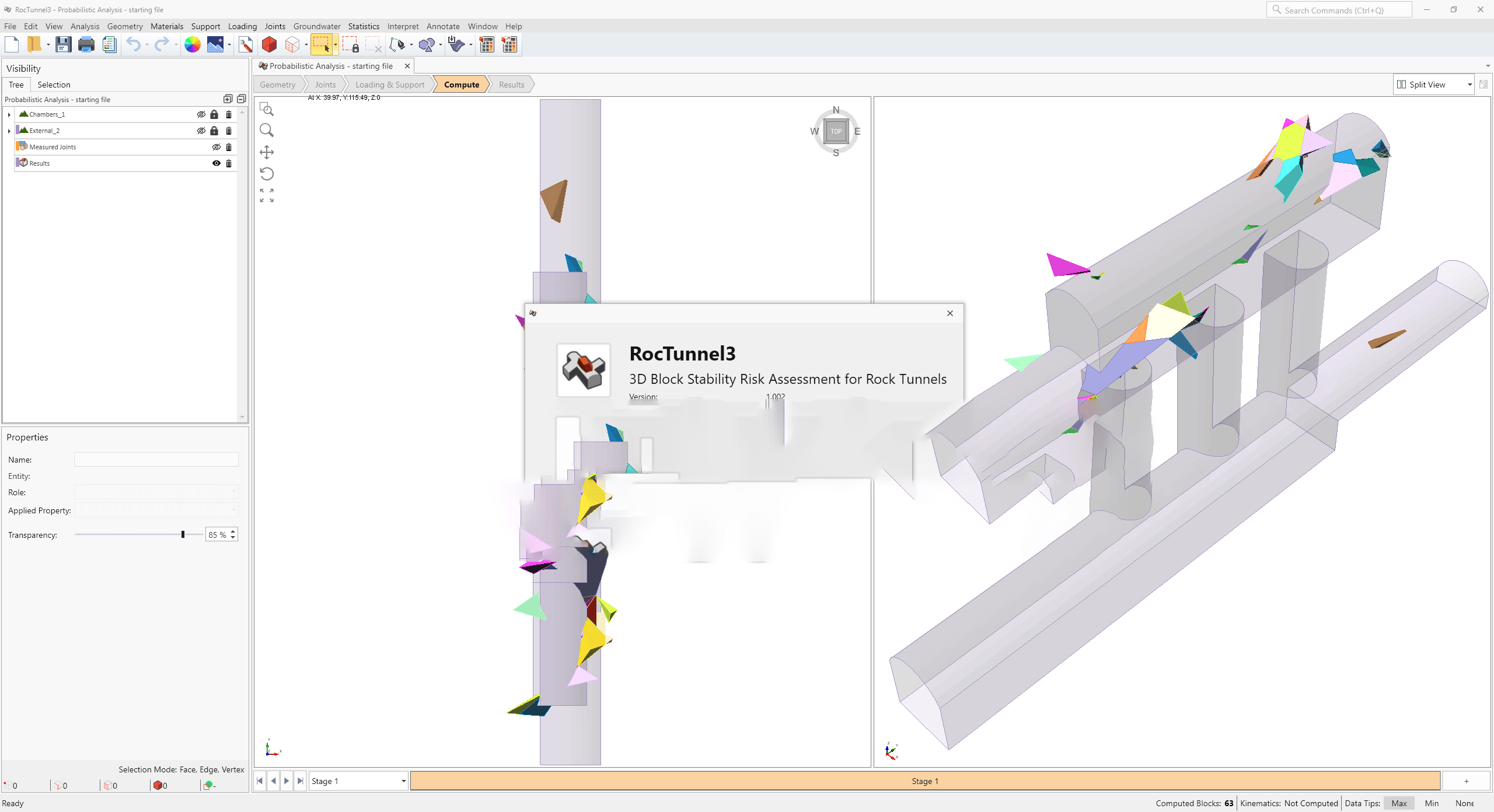 Find valid block formations by intersecting joints and calculate the factor of safety in deterministic analysis. You can sample rock unit weights, joint shear strength, and water pressure across simulations to calculate block failure probability.