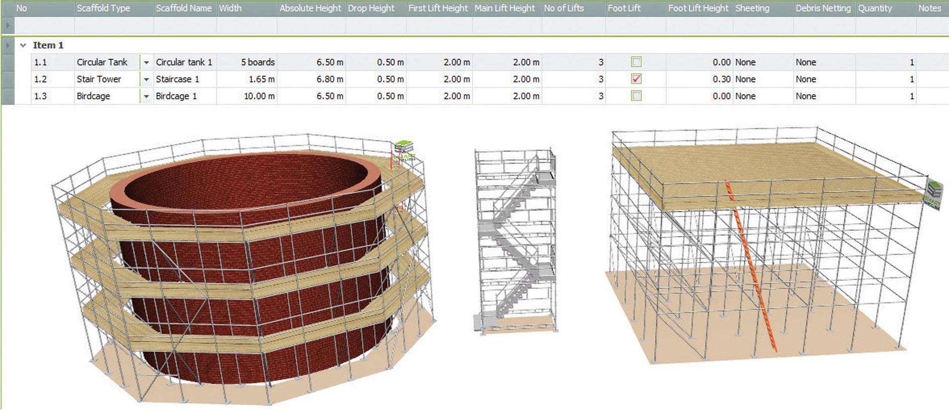 3D Scaffolding Modeling: Create detailed 3D models of scaffolding structures using a comprehensive library of standard scaffolding components (tubes, couplers, boards, braces, etc.).